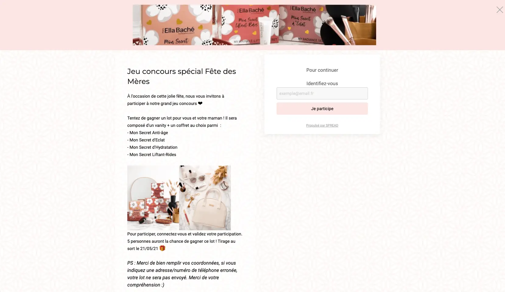 Regardez par exemple, notre client “Ella Baché” qui a organisé un jeu concours pour la fête des mères. La marque a eu la superbe idée de mettre en jeu 5 coffrets de leur gamme de produits pour 5 participants et leur maman ! Chouette initiative, non ?